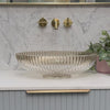 The sleek oval fluted design of the Capara is a captivating centerpiece for any bathroom when it rests gracefully upon the vanity. The clear glass infuses an air of expansiveness, framing the graceful dance of water. Its understated design seamlessly unites purpose and beauty, presenting a low-maintenance exterior compatible with diverse faucet designs. Elevating everyday rituals to opulent engagements, this modern basin elegantly amalgamates artistry and utility, reimagining the bathroom arena.