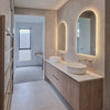 Bringing soft curves and a gentle glow to your space, the Arco Arch LED Mirror with Frosted Glass Border features a clean, frameless arch silhouette that adds timeless elegance to modern bathrooms. The backlighting diffuses through the frosted glass border, creating an ambient glow that highlights the mirror’s edges while softly illuminating the surrounding space.