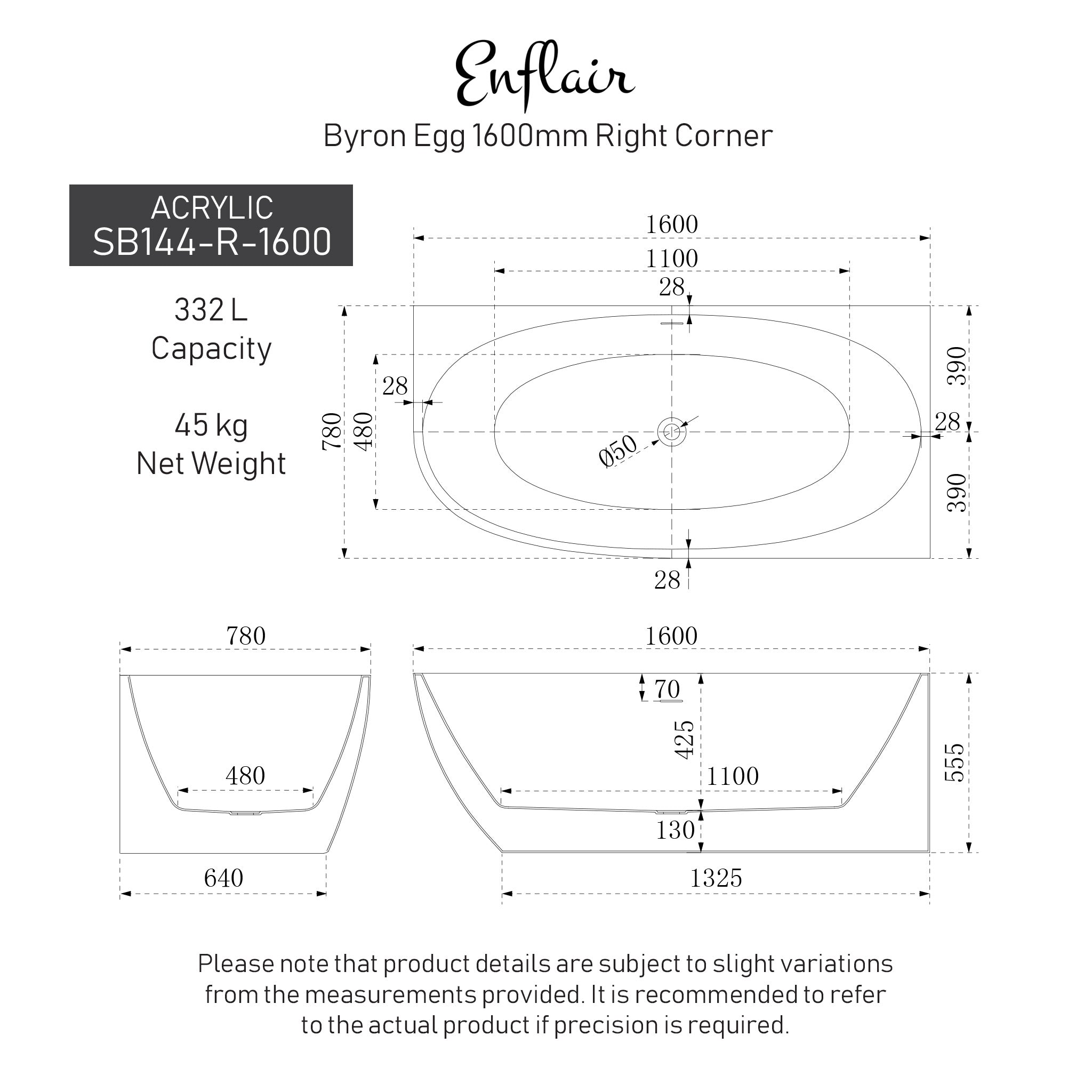 Byron Egg 1600mm Right Corner Freestanding Bath, Matte White