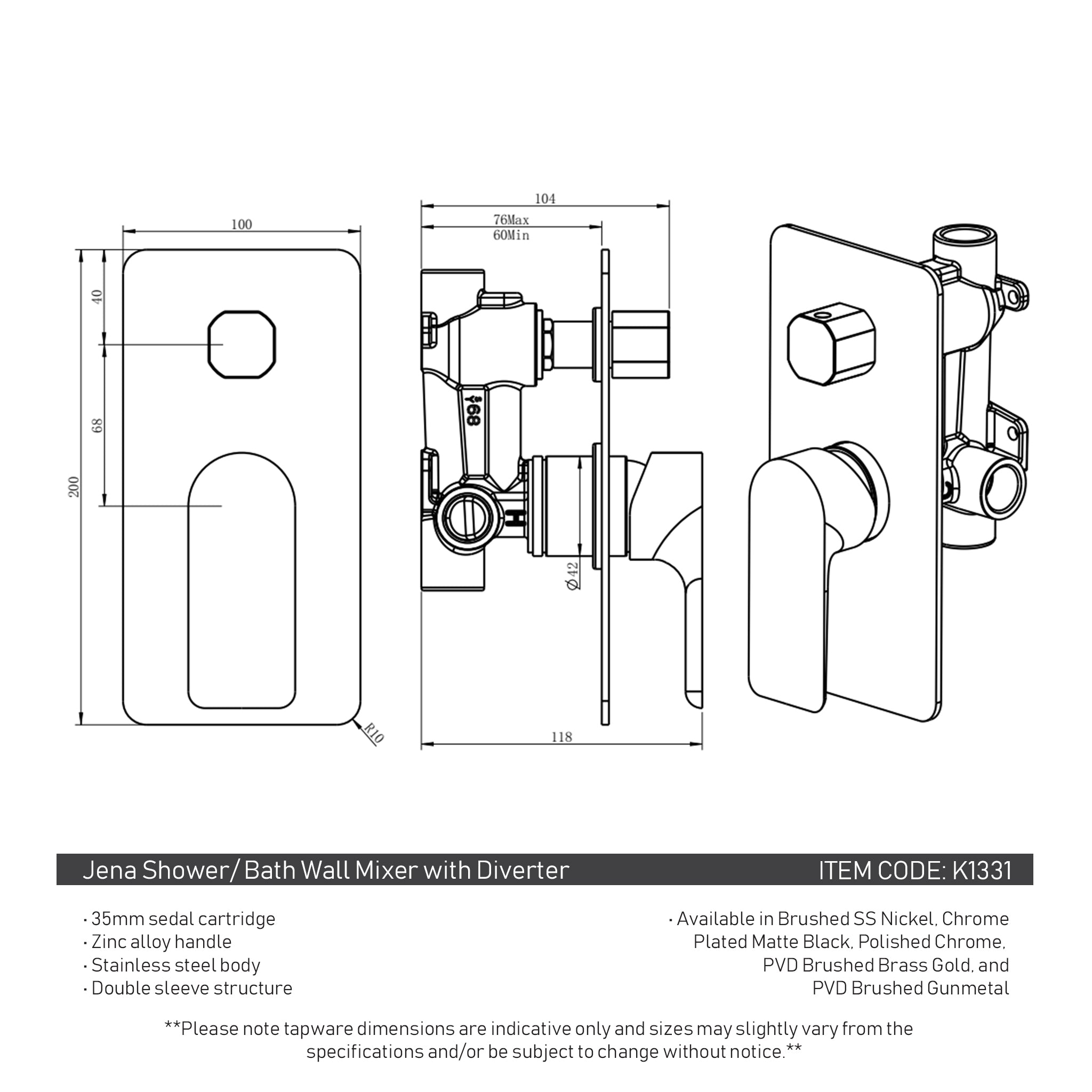 **Please note tapware dimensions are indicative only and sizes may slightly vary from the specifications and/or be subject to change without notice.**