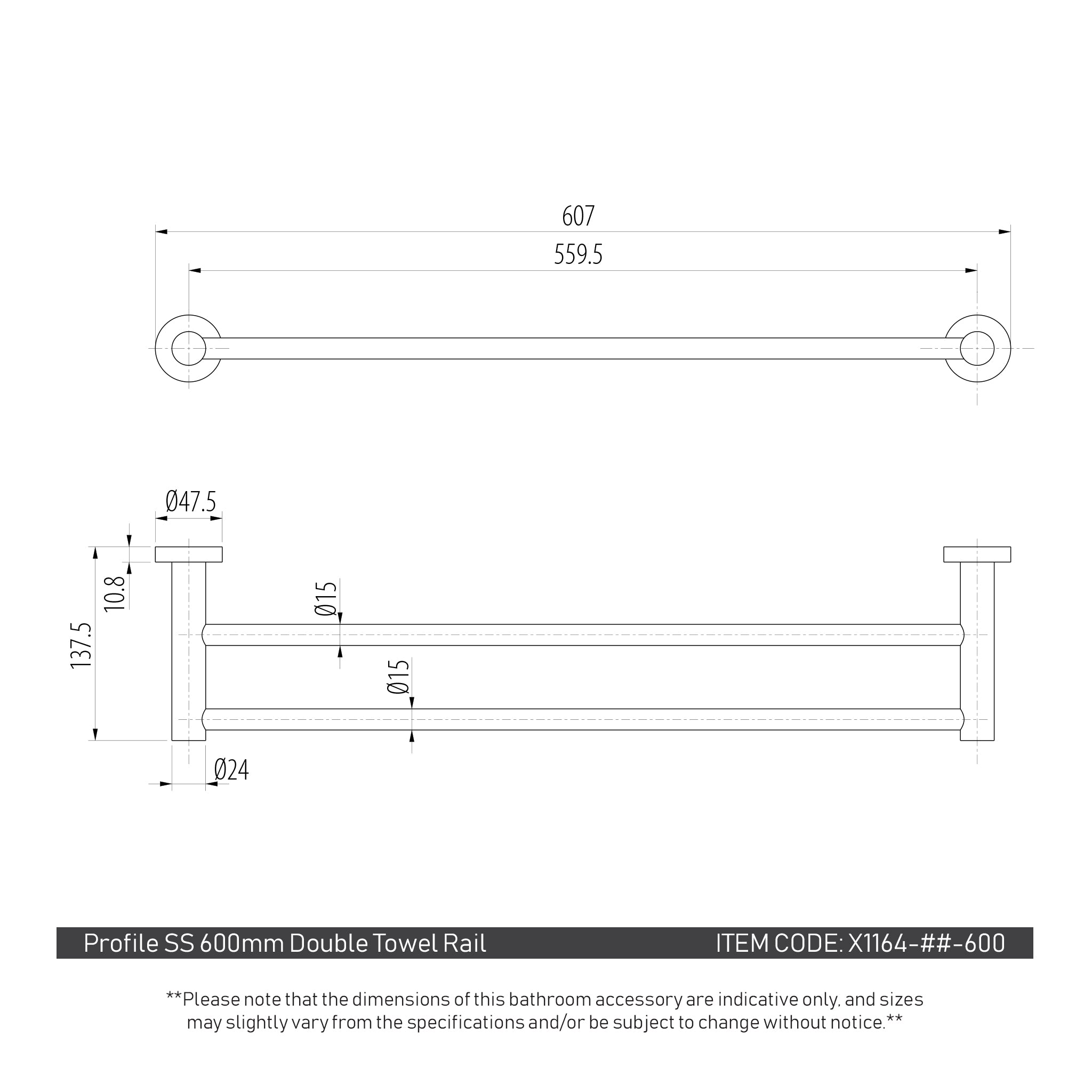 Complement your bathroom tapware and accessories effortlessly with the Profile SS 600mm Double Towel Rail, offered in a range of stylish coloured finishes.