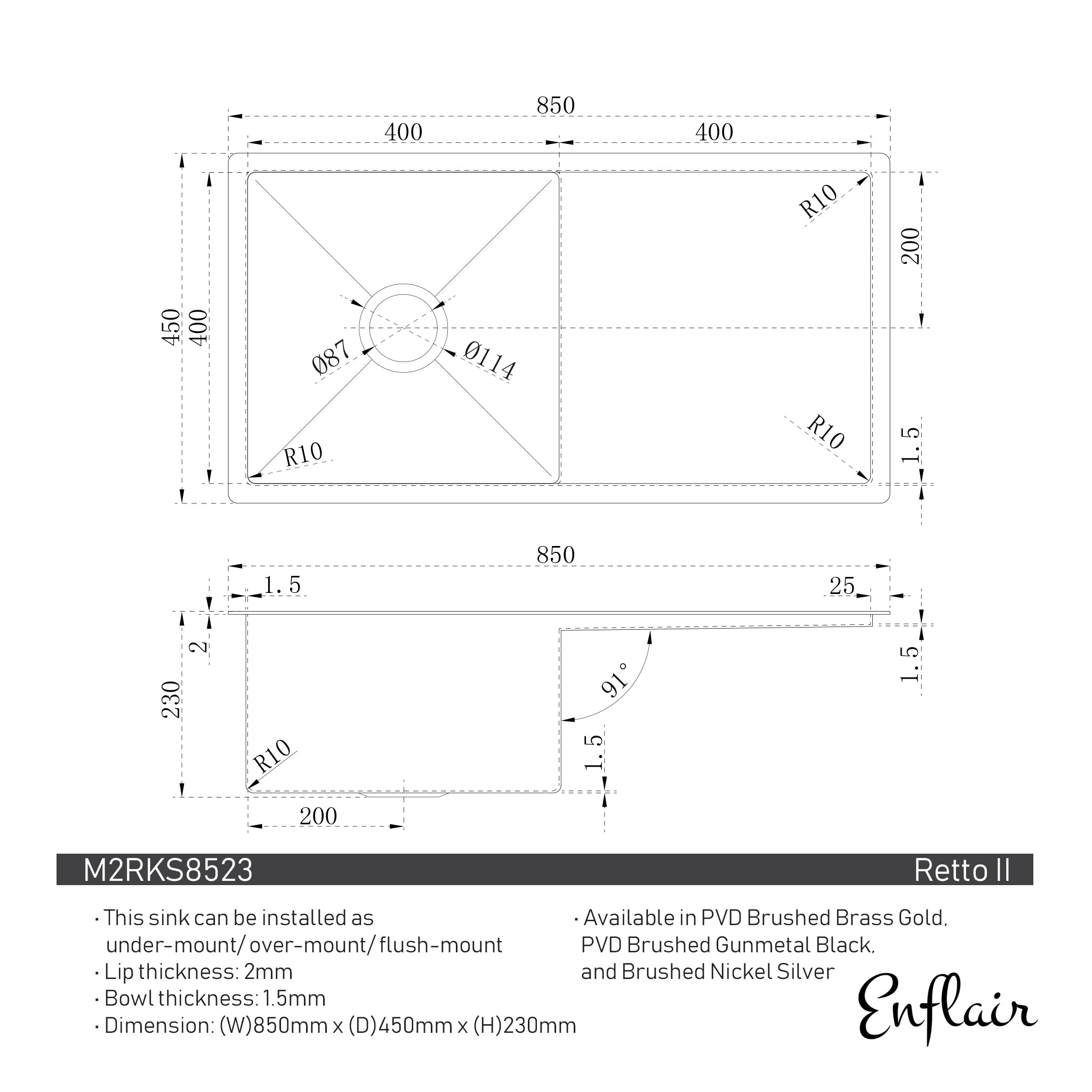 - Universal Installation: may be installed as under-mount, over-mount or flushline