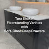 The Tura Shaker floorstanding vanity blends soft curves with functional design. Finished in a durable triple lacquer coat, it features soft-close, deep drawers that fully extend for easy access and everyday convenience.